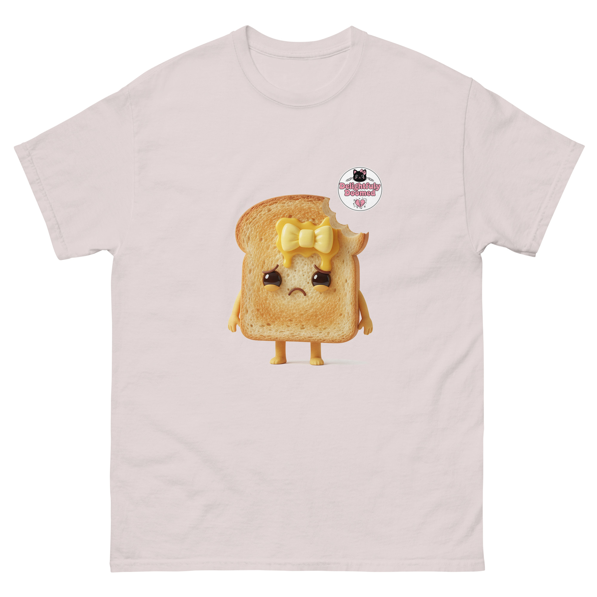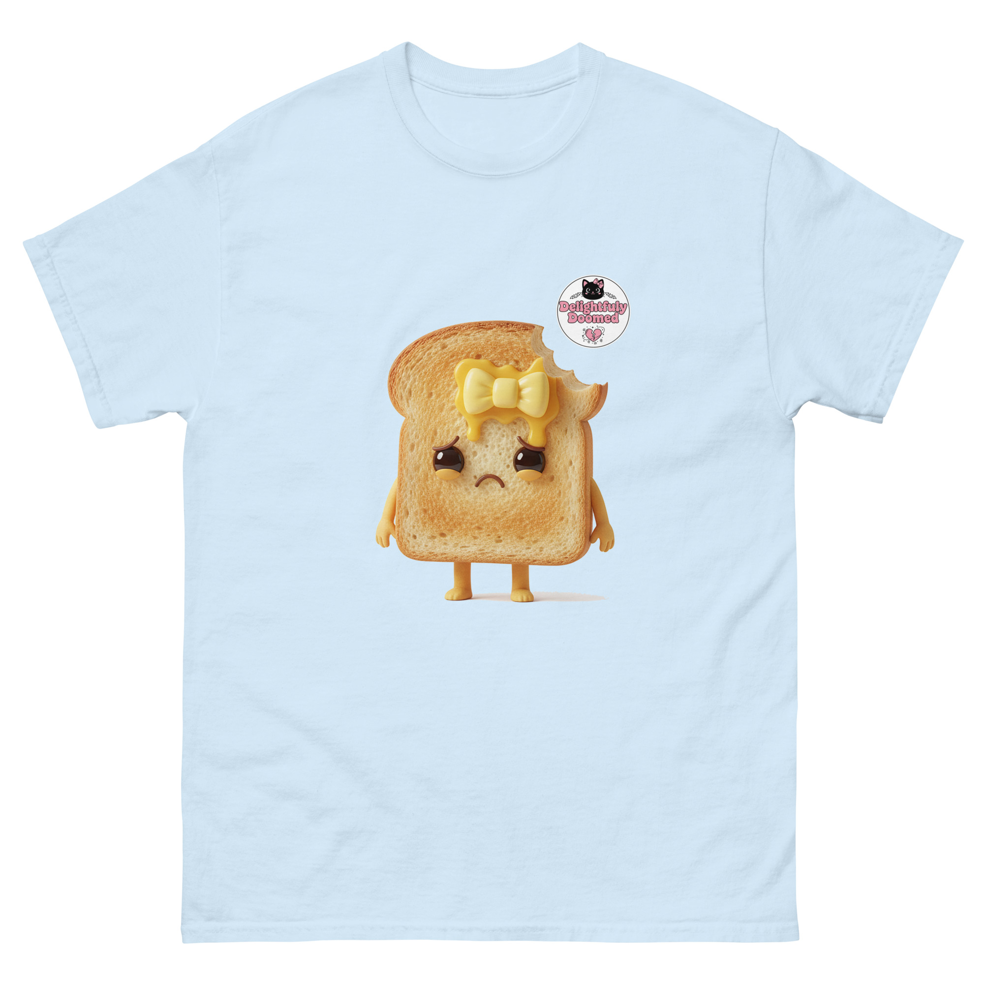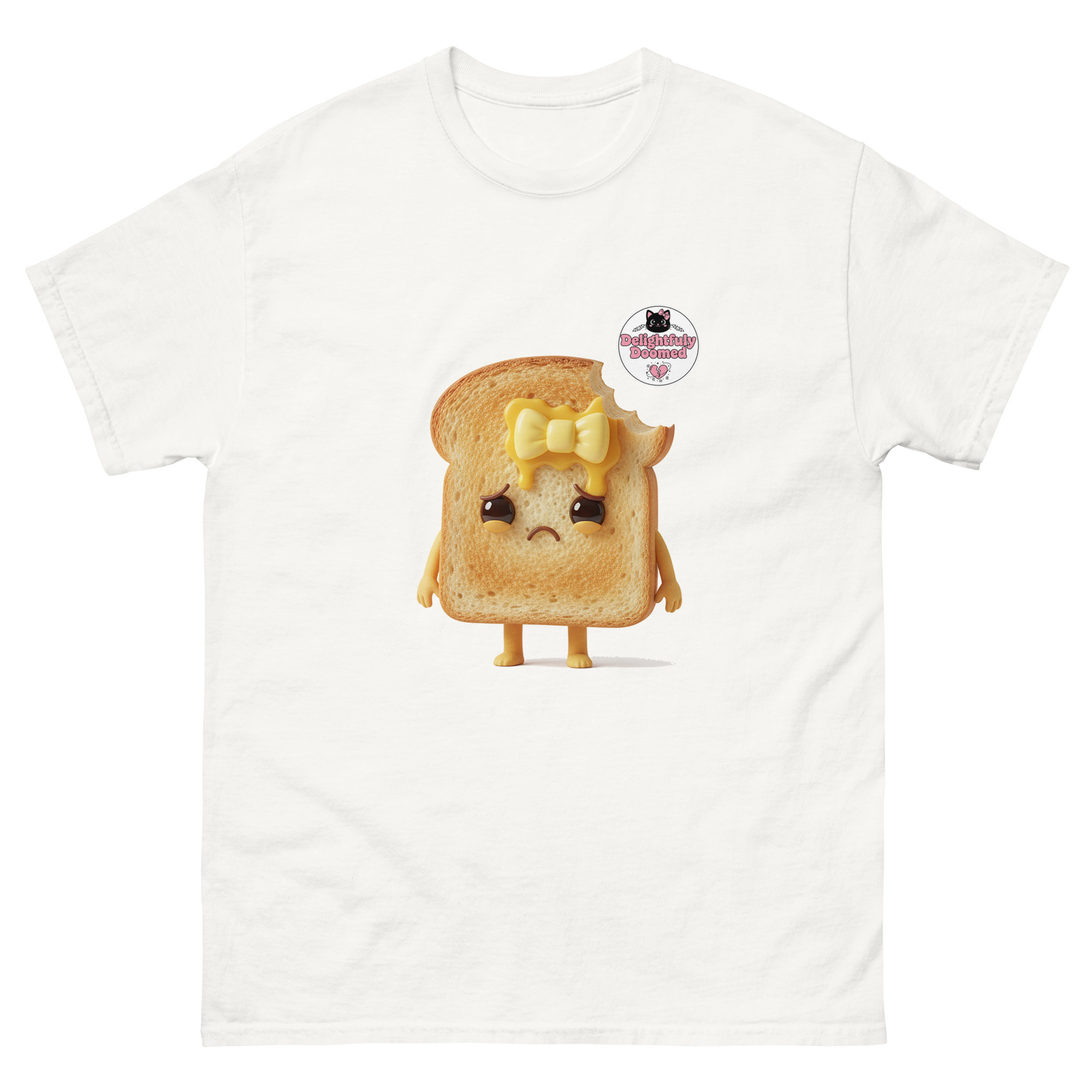 Start your day with a smile (and maybe a bite). This Delightfully Doomed tee features our lovable toast character — happy, cute, and missing just one tiny piece of himself. Perfect for fans of adorable chaos, dark humor, and carbs with character.