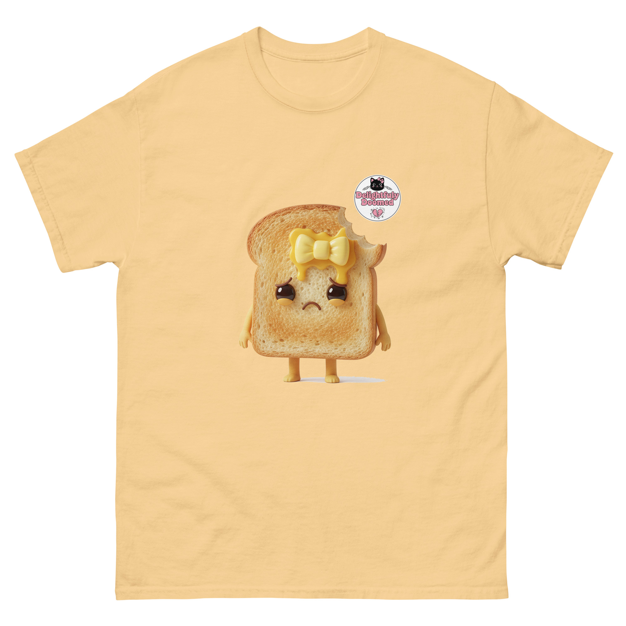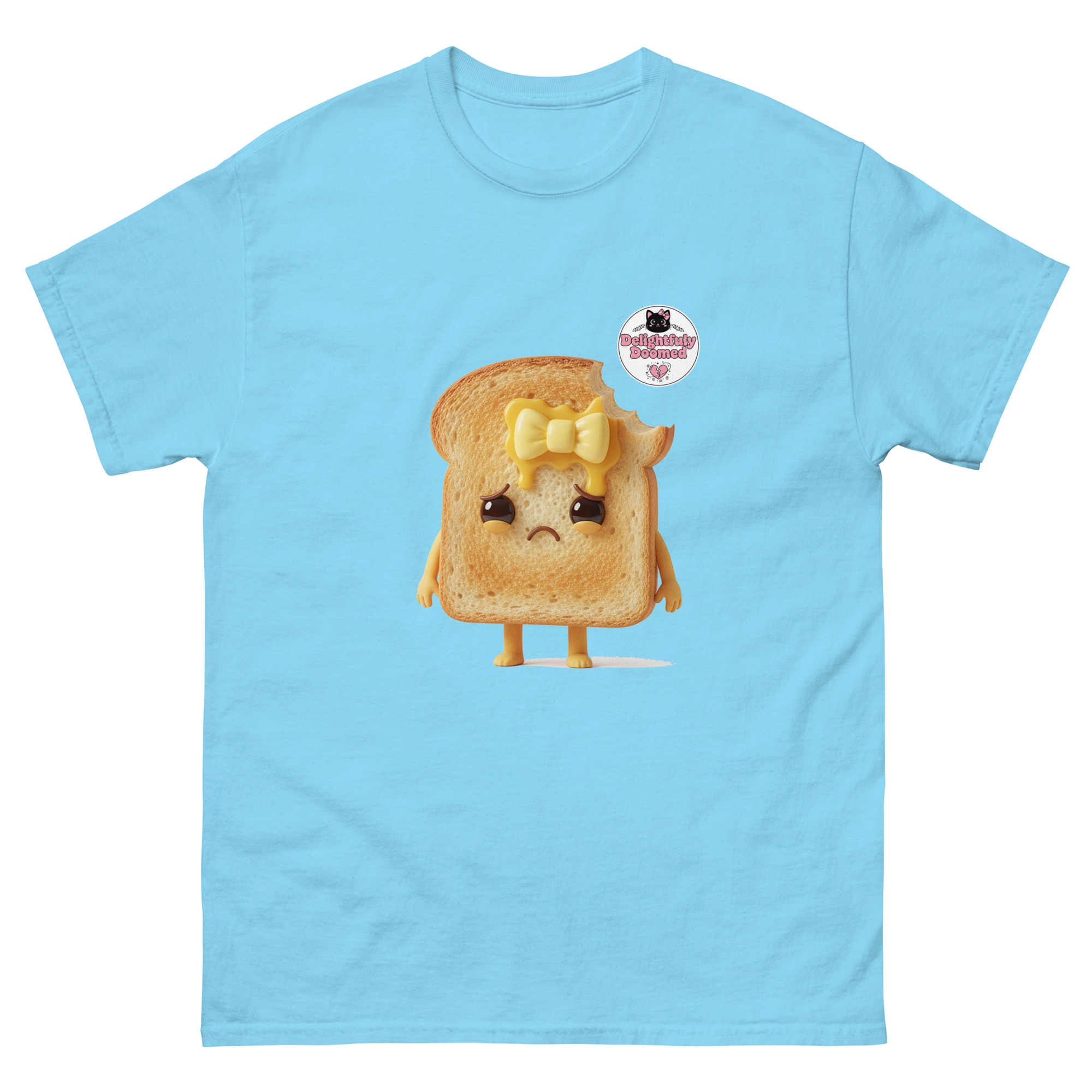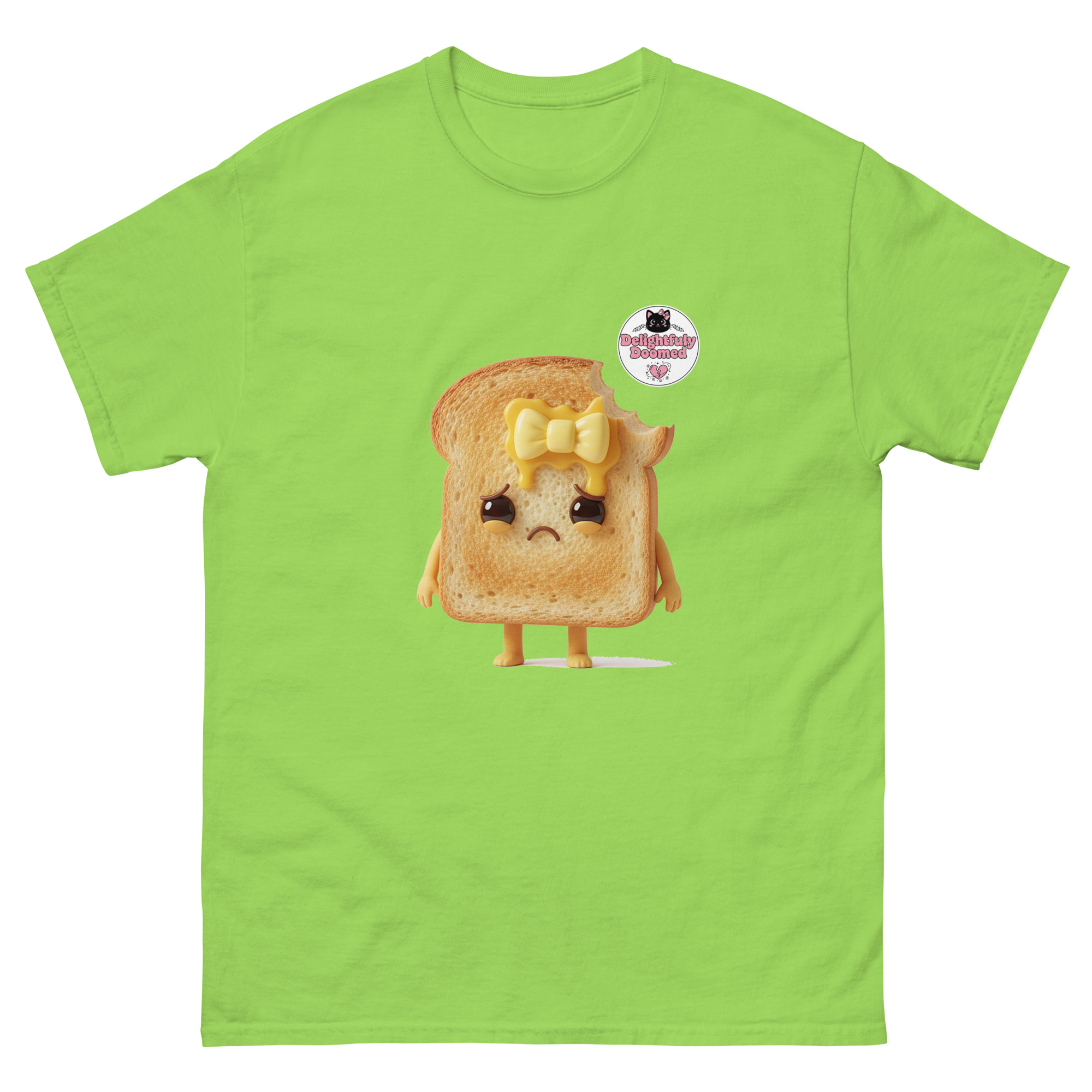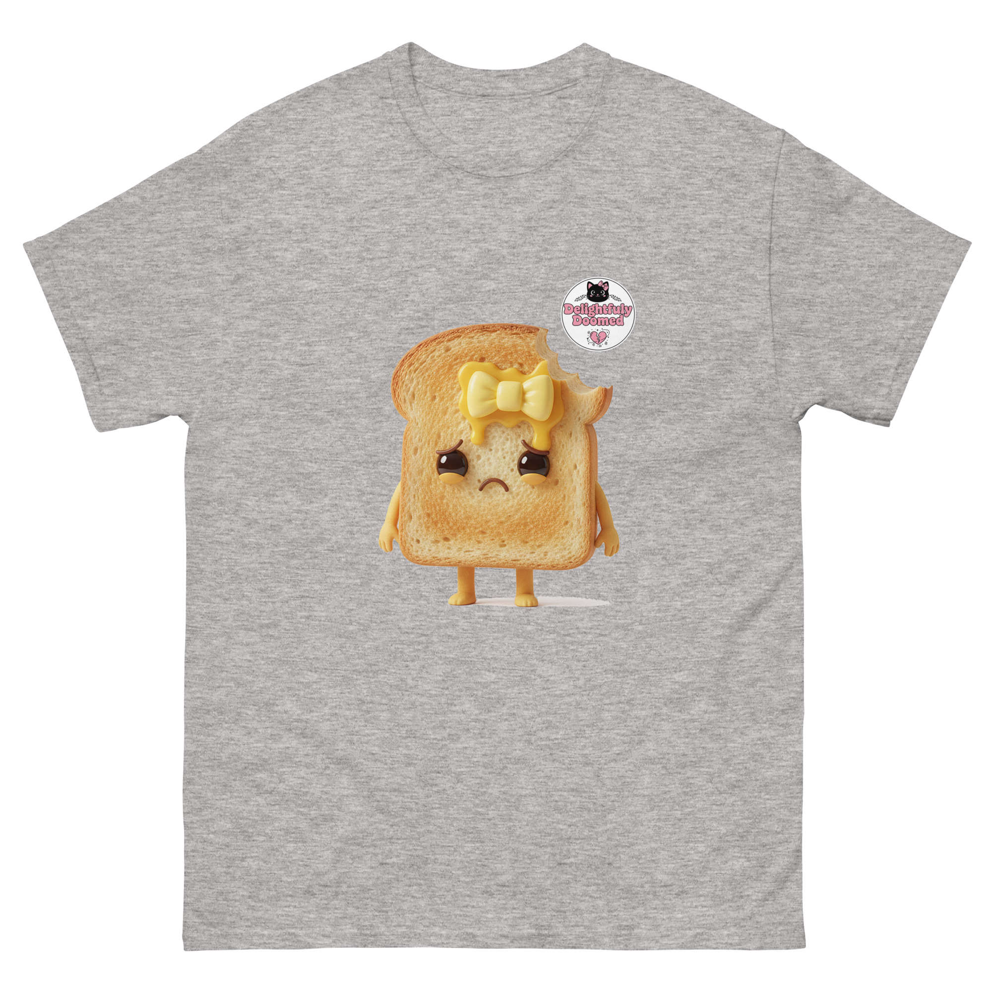 Start your day with a smile (and maybe a bite). This Delightfully Doomed tee features our lovable toast character — happy, cute, and missing just one tiny piece of himself. Perfect for fans of adorable chaos, dark humor, and carbs with character.