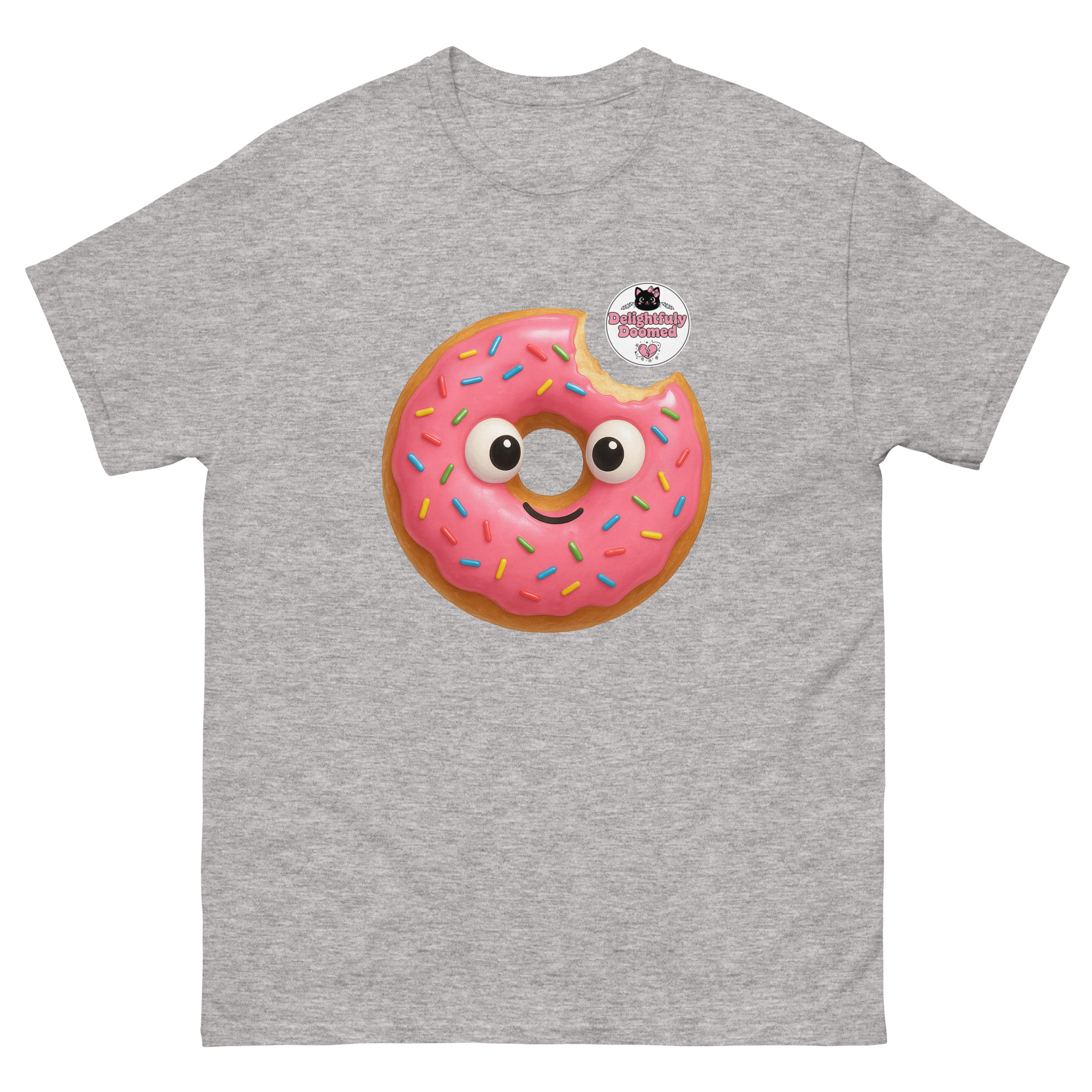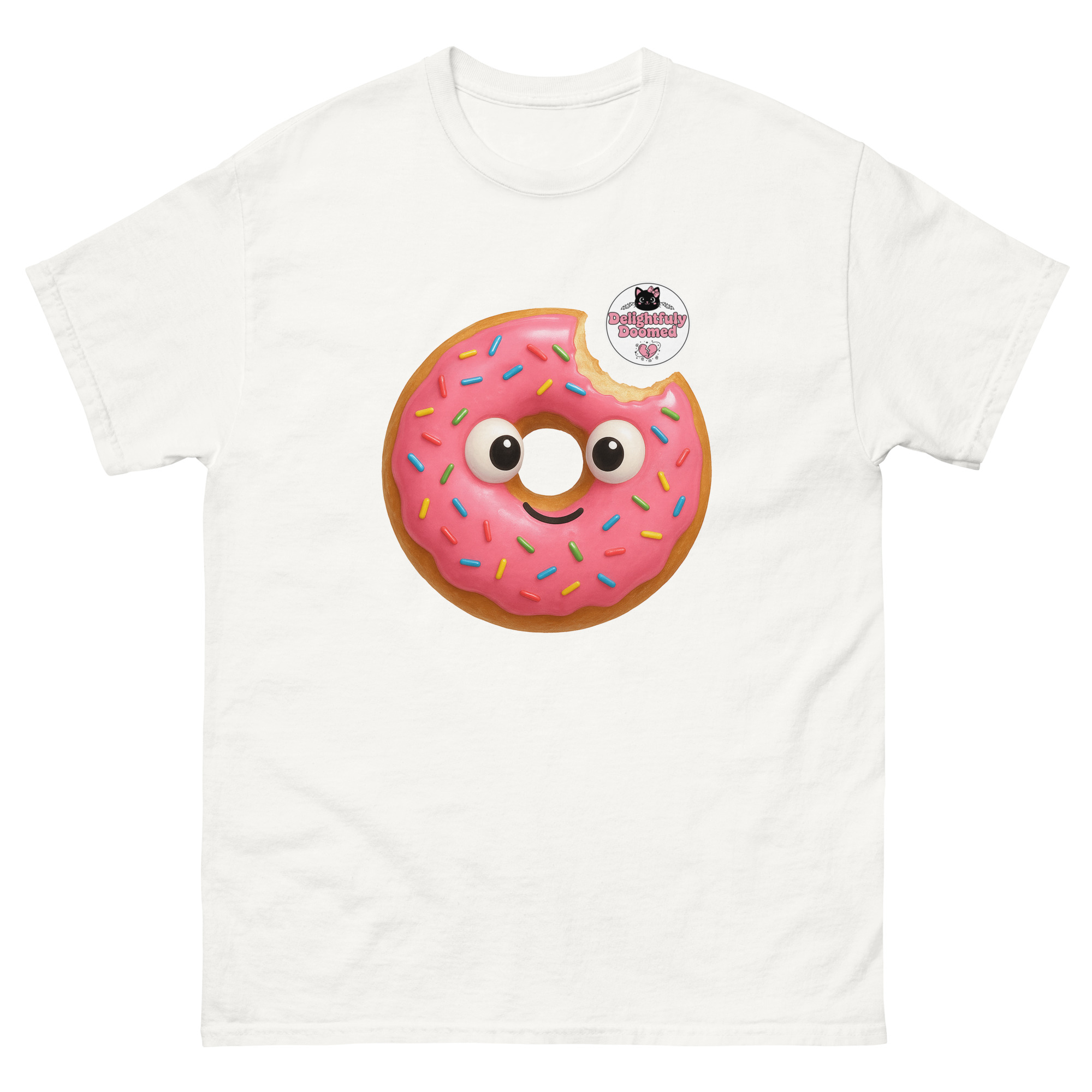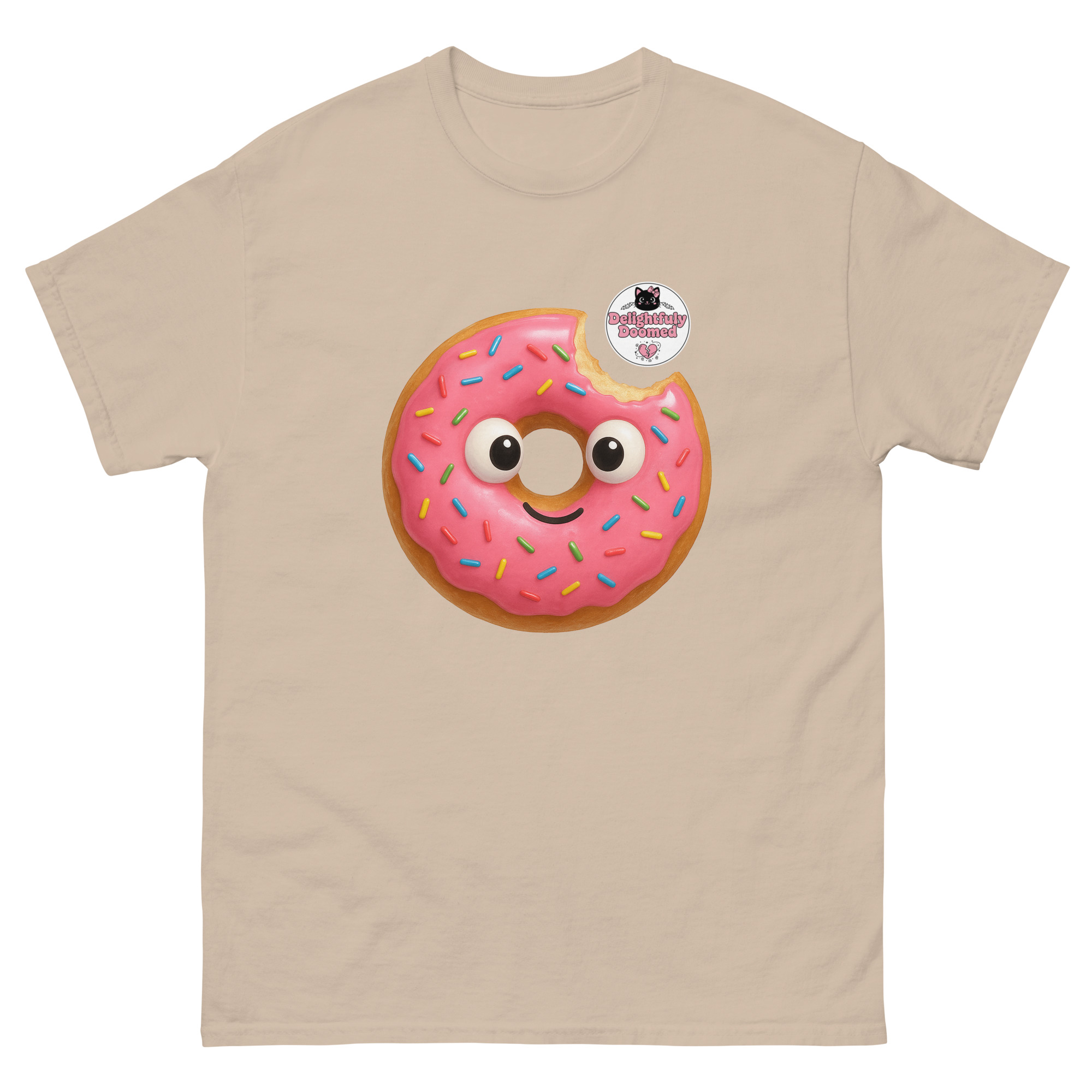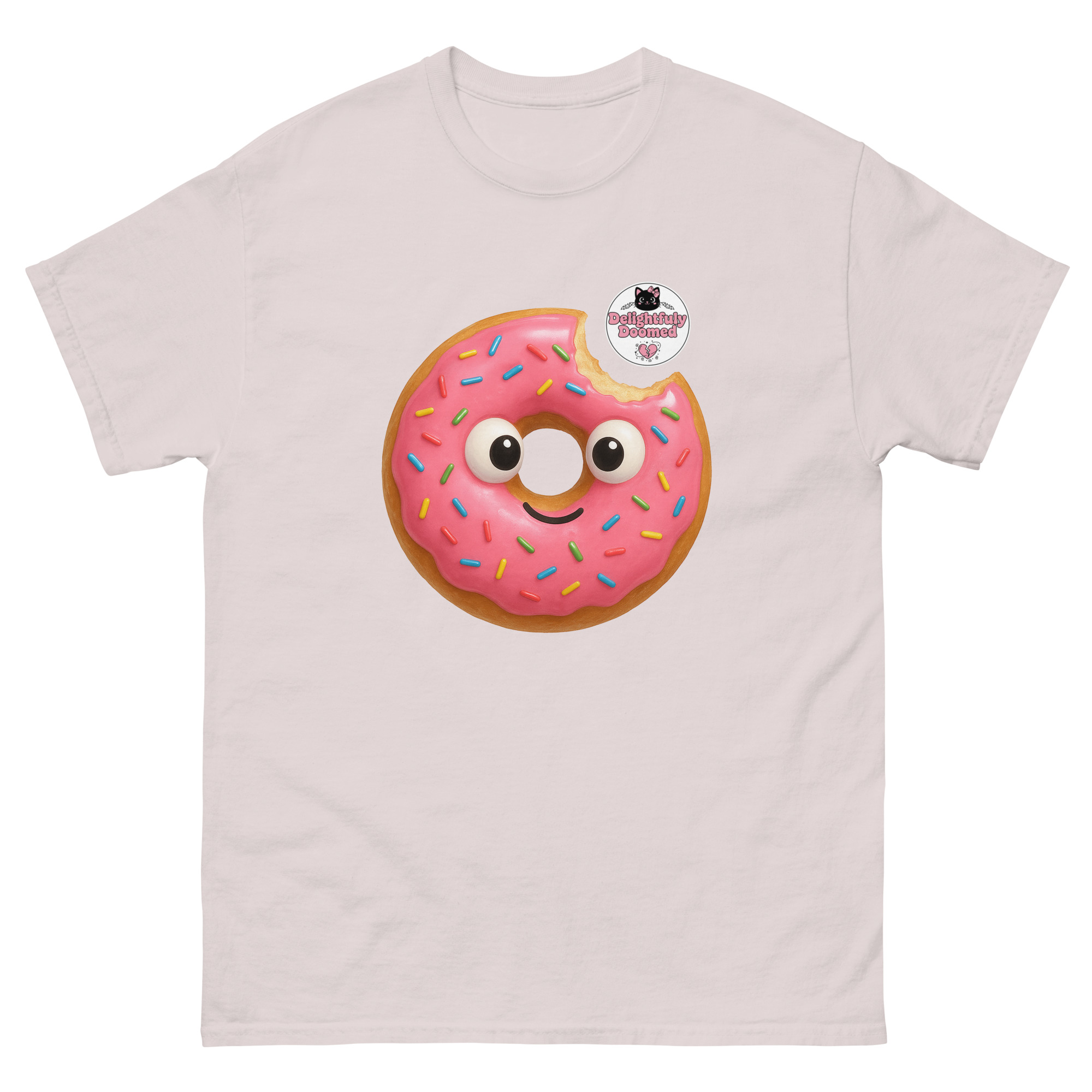 Sweet, soft, and just a little bit doomed — this Delightfully Doomed tee features our beloved bitten donut design: a hyper-realistic pink-frosted treat with big cartoon eyes and an even bigger smile (despite losing a bite). Perfect for lovers of cute chaos, coffee shop vibes, and pastries with personality.