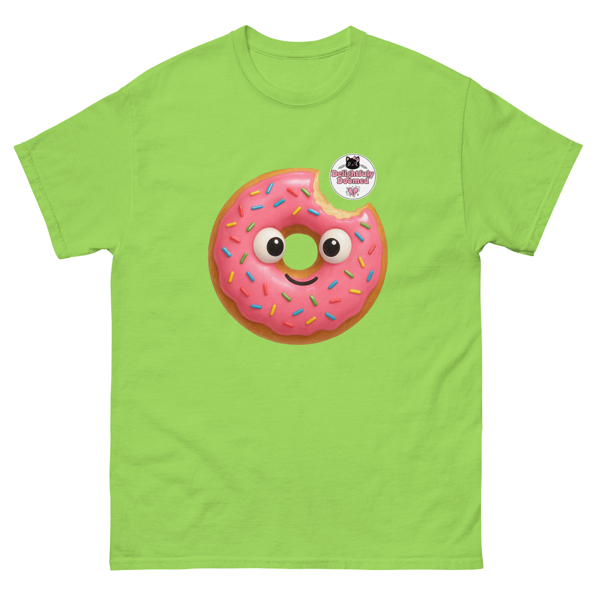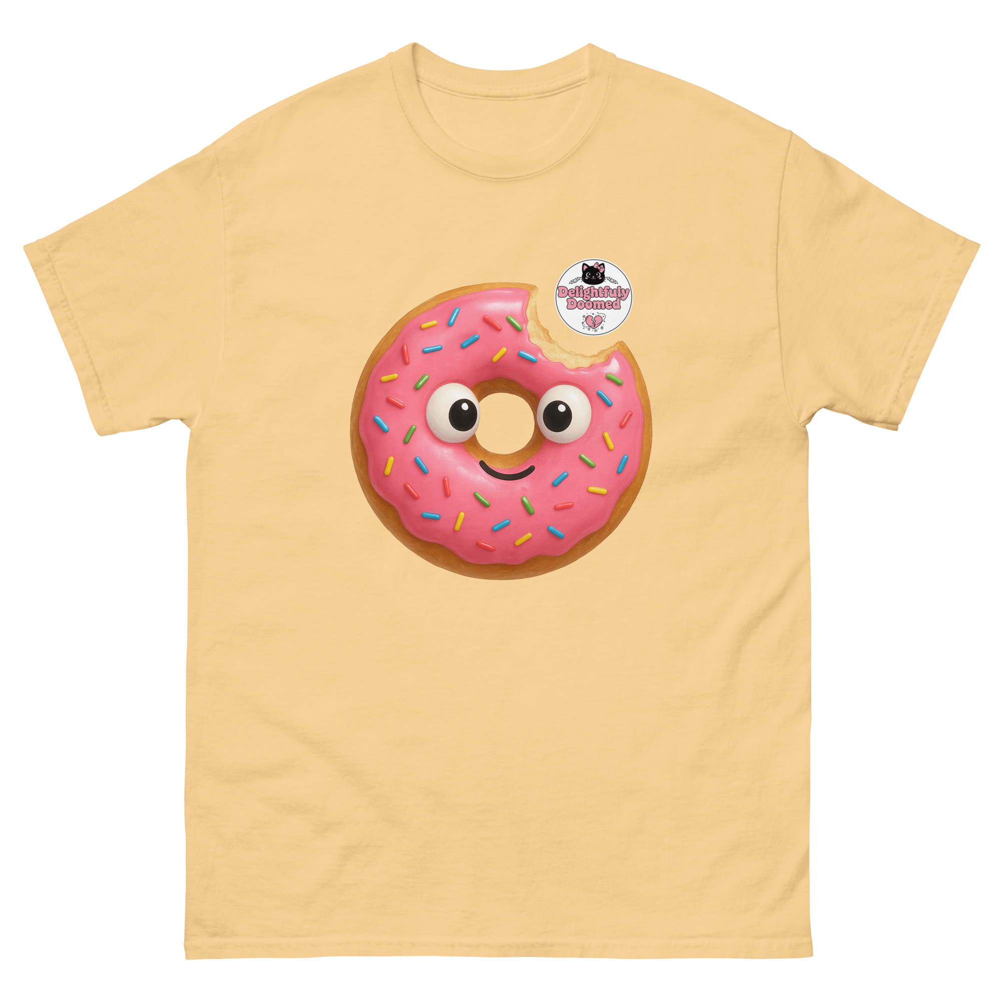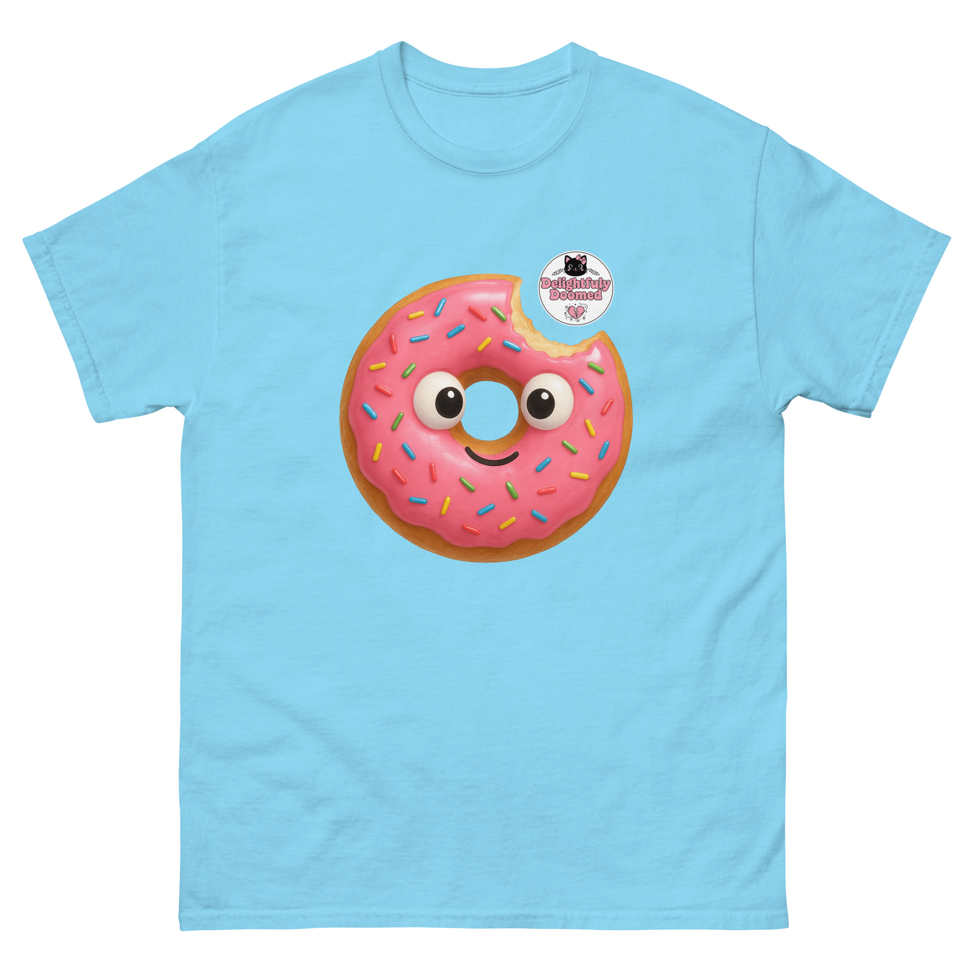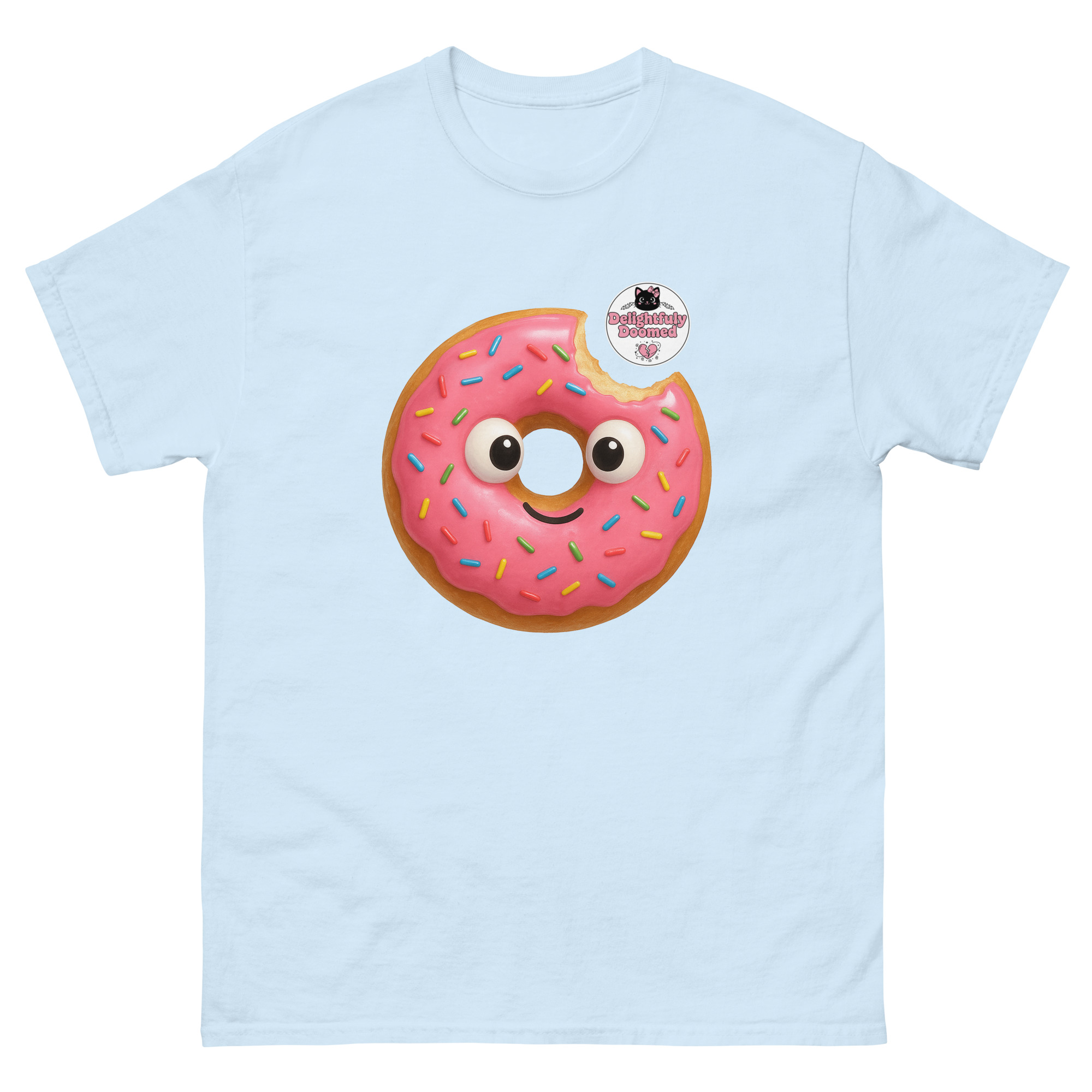 Sweet, soft, and just a little bit doomed — this Delightfully Doomed tee features our beloved bitten donut design: a hyper-realistic pink-frosted treat with big cartoon eyes and an even bigger smile (despite losing a bite). Perfect for lovers of cute chaos, coffee shop vibes, and pastries with personality.